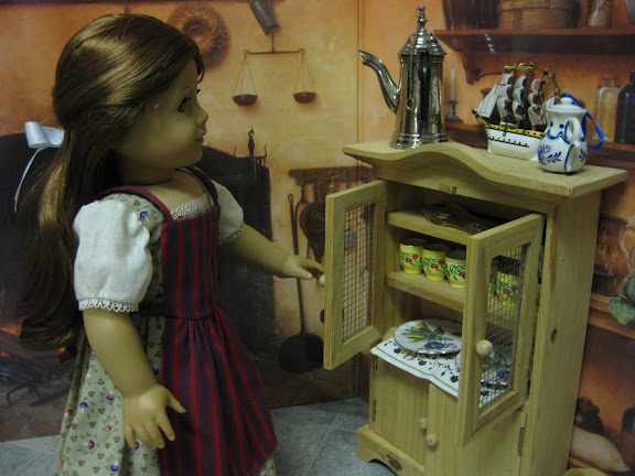 Felicity checks out her China cabinet. (I got the jelly cabinet for $13--the price also included the shipping! The model ship and blue teapot are Christmas ornaments I found in California for $4 each.)